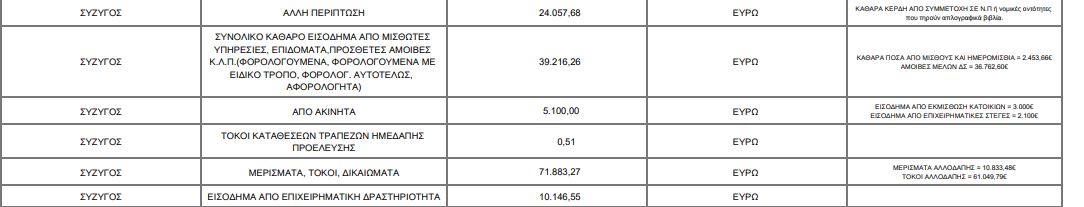 Καθαρά κέρδη 24.057 ευρώ από συμμετοχή σε εταιρεία. Επίσης συνολικό εισόδημα 39.216 ευρώ από μισθούς και ημερομίσθια και αμοιβές μελών δ.σ.