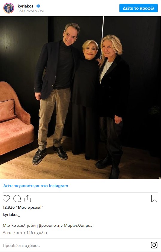 Ο Έλληνας πρωθυπουργός χαρακτήρισε, σε ανάρτησή του, τη βραδιά στη Μαρινέλλα ως καταπληκτική.