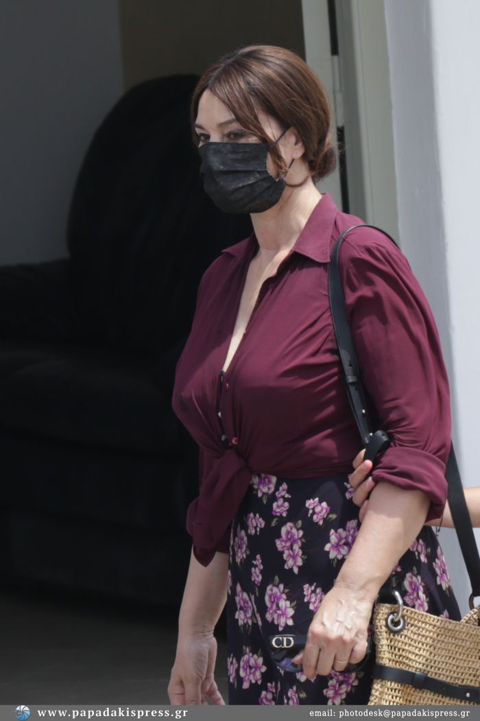 Ντυμένη με μπορντό πουκάμισο και μακριά floral φούστα, έχοντας τα μαλλιά της πιασμένα, η Μόνικα Μπελούτσι ήταν απέριττη και εντυπωσιακή.