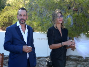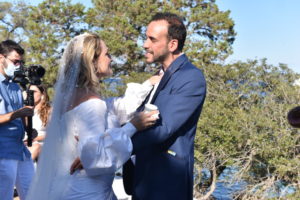 O Πάνος συνοδευόταν από τη σύντροφο του Τζίνα Βαρελά. Το ζευγάρι είχε φτάσει στο νησί από την Παρασκευή και παραβρέθηκε και στο pre wedding party που είχαν διοργανώσει οι νεόνυμφοι για τους φίλους τους. Μετά το μυστήριο εκείνος έσπευσε να ευχηθεί στην αγαπημένη του φίλη και στον σύζυγο της. Η Τζίνα που είναι πάντα διακριτικά δίπλα του, επέλεξε για την περίσταση ένα μαύρο μίνι φόρεμα που αναδείκνυε την καλλίγραμμη σιλουέτα της.