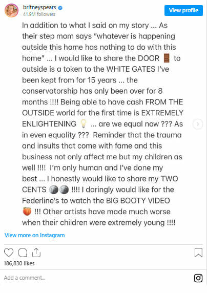 Αργότερα επανήλθε με δημοσίευση στο προφίλ της και αναφέρθηκε στην υποχρεωτική κηδεμονία της και τον ρόλο που έπαιξε στη ζωή της.