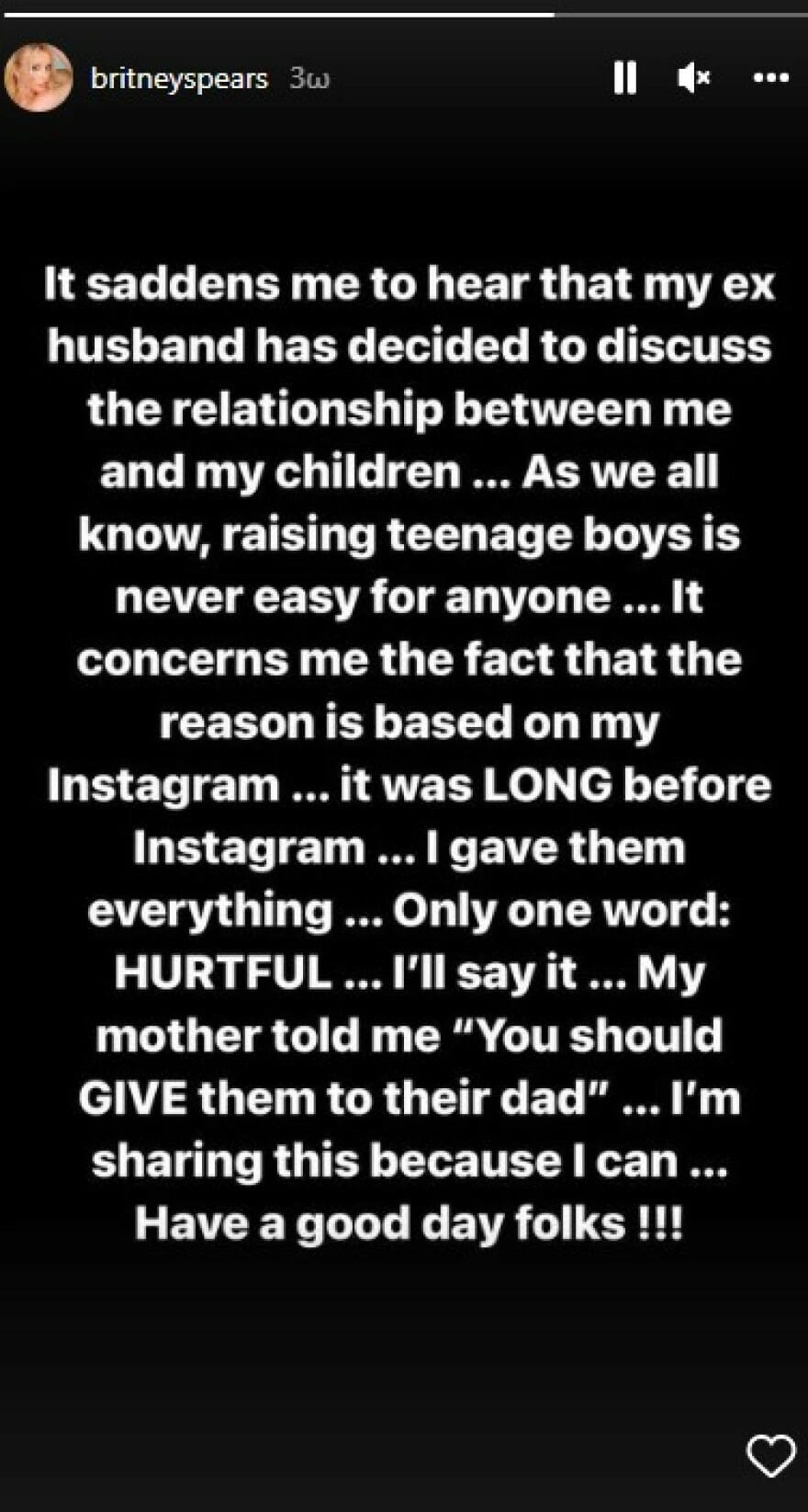 Η Σπίαρς αντέδρασε άμεσα. Αρχικά έγραψε σε Instagram story της: «Με απογοητεύει να ακούω ότι ο πρώην σύζυγός μου αποφάσισε να συζητήσει για τη σχέση ανάμεσα σε έμενα και τα παιδιά μου…