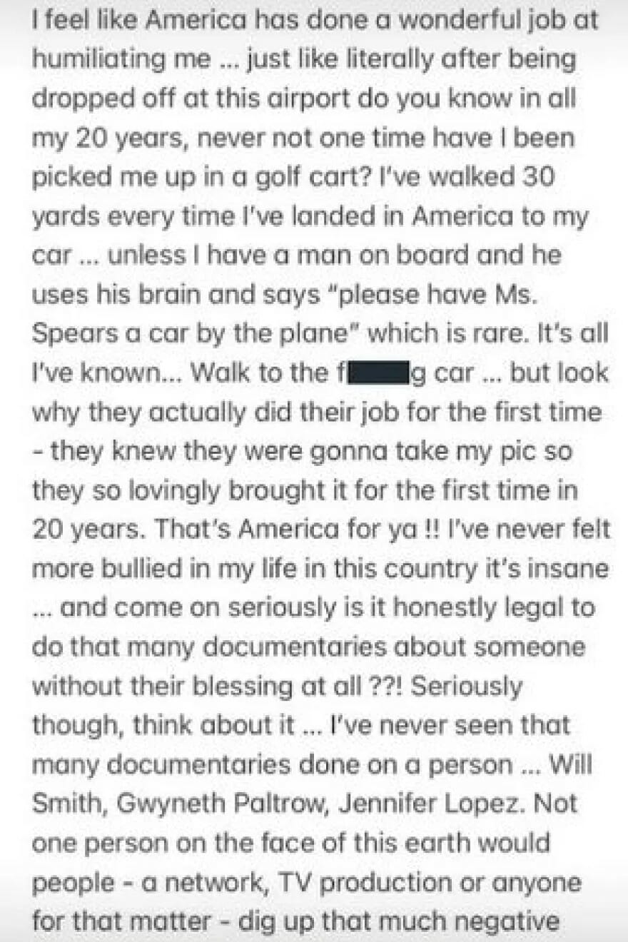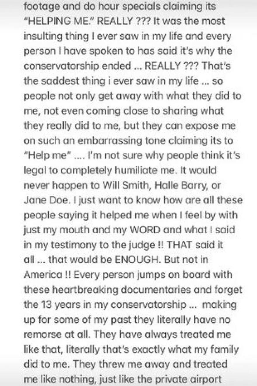 Στoν προσωπικό της λογαριασμό στο Instagram η Μπρίτνεϊ Σπίαρς ανέφερε: «Αισθάνομαι ότι η Αμερική έκανε θαυμάσια δουλειά για να με ταπεινώσει…». «Ποτέ δεν ένιωσα περισσότερο bullying στη ζωή μου σε αυτή τη χώρα, είναι τρελό… και έλα τώρα σοβαρά, είναι ειλικρινά νόμιμο να κάνεις τόσα πολλά ντοκιμαντέρ για κάποιον, χωρίς την συγκατάθεσή του;». Σε συνέχεια της δημοσίευσής της, η Αμερικανίδα τραγουδίστρια σημείωσε: «Δεν έχω δει, τόσα πολλά ντοκιμαντέρ να έχουν γίνει για έναν άνθρωπο… Γουίλ Σμιθ, Γκουίνεθ Πάλτροου, Τζένιφερ Λόπεζ, σε κανέναν άλλο άνθρωπο αυτής της γης, δεν έγιναν τόσο αρνητικά σχόλια σε ντοκιμαντέρ. Το νέο ντοκιμαντέρ ήταν το πιο προσβλητικό πράγμα, που έχω δει ποτέ στη ζωή μου».