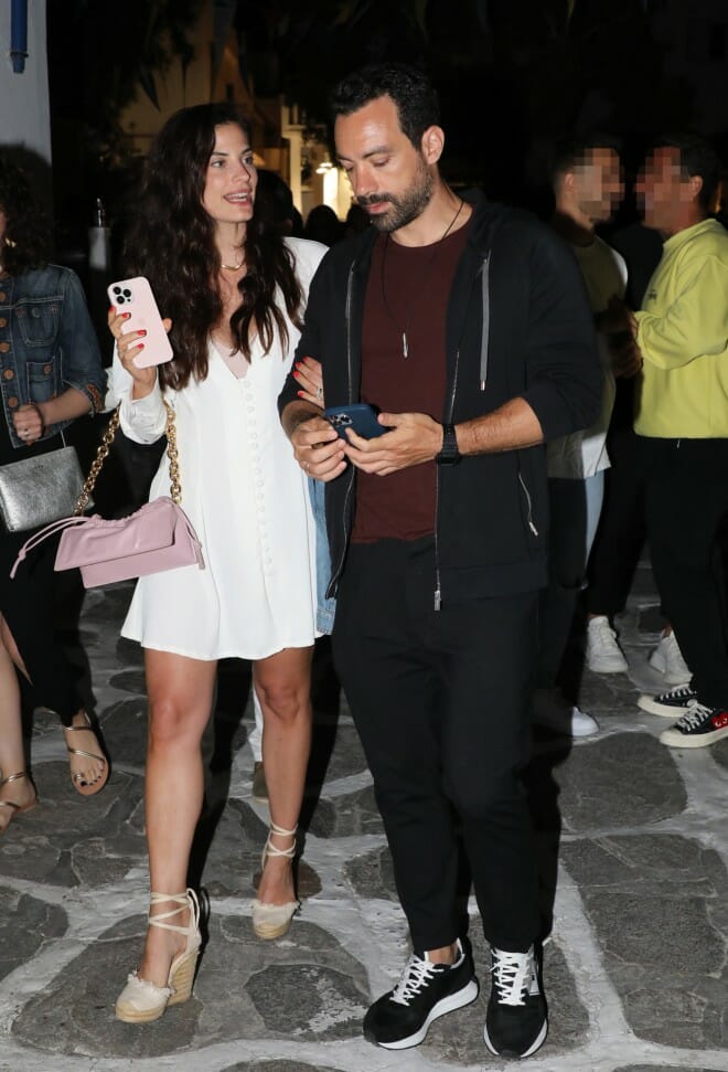 Μόνο απαρατήρητοι δεν πέρασαν το ζευγάρι Χριστίνα Μπόμπα – Σάκης Τανιμανίδης. Η γοητευτική Χριστίνα επέλεξε ένα λευκό φόρεμα για την έξοδο της κρατόντας ένα τζν μπουφάν αν γίνουν ισχυροι οι άνεμοι. Το απόλυτο παπούτσι για το νησί είναι οι εσπαντρίγιες οι οποίες ήταν κι αυτεσ σε λευκό χρώμα για να ταιριάξει με το σύνολο. Το ζευγάρι πυο ακουγεται ότι νοίκιασε σπιτι για το καλοκαίρι στο νησί για να χαρουν την θάλασσα με τα παιδιά τους, έχει παρέα την μητέρα του Σάκη . Ωστόσο στα γραφικά σοκάκια ο φωτογραφικός φακός τους εντόπισε μαζί με τους κουμπάρους τους Μαρίνα Βερνίκου και Μίλτο Καμπουρίδη.