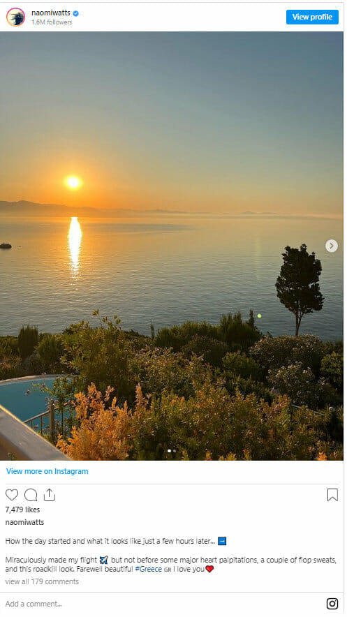 Η χολιγουντιανή σταρ Ναόμι Γουότς προχώρησε σε δημοσίευση στον προσωπικό της λογαριασμό στο Instagram μέσω της οποίας έκανε γνωστή την αναχώρησή της από τη χώρα μας.