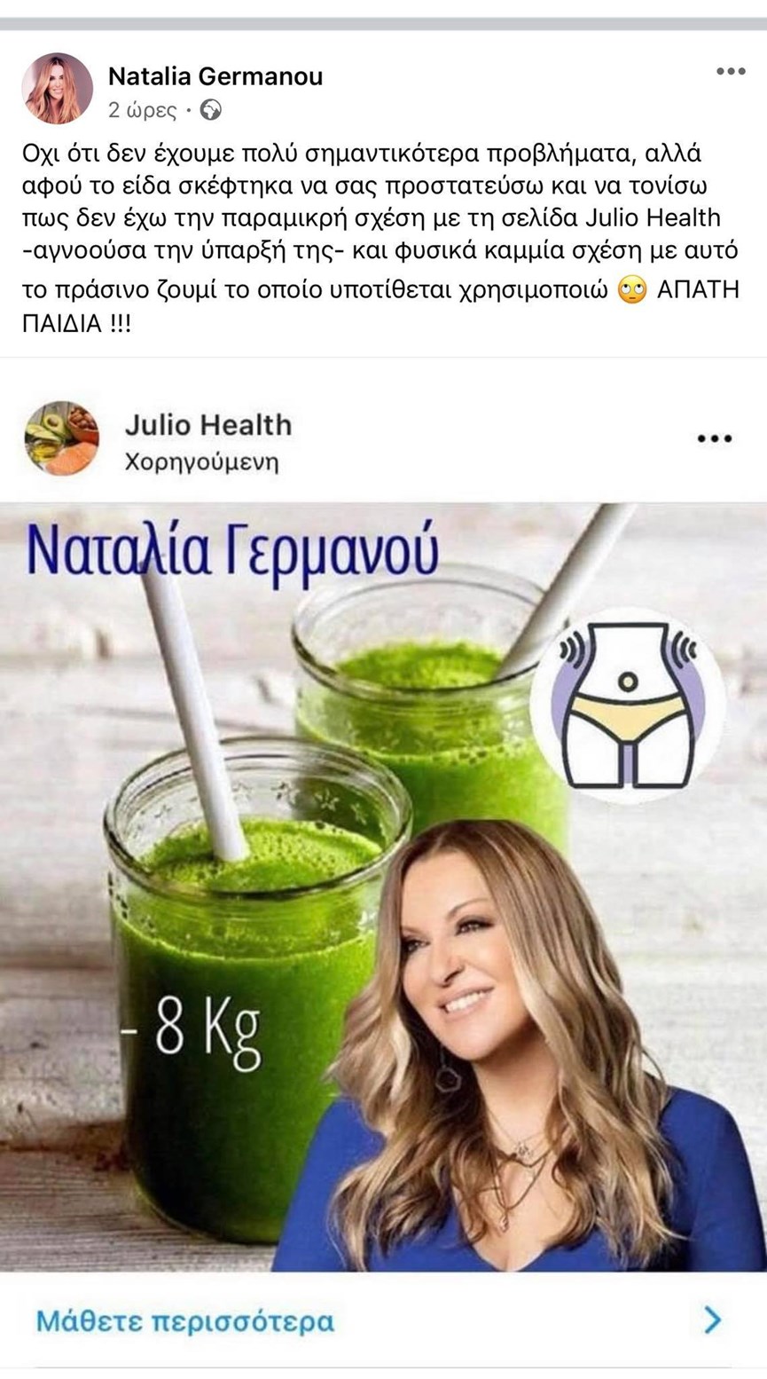 «Όχι ότι δεν έχουμε πολύ σημαντικότερα προβλήματα, αλλά αφού το είδα σκέφτηκα να σας προστατεύσω και να τονίσω πως δεν έχω την παραμικρή σχέση με την σελίδα Julio Health- αγνοούσα την ύπαρξη της- και φυσικά καμία σχέση με αυτό το πράσινο ζουμί το οποίο υποτίθεται χρησιμοποιώ! ΑΠΑΤΗ ΠΑΙΔΙΑ».