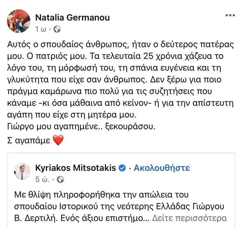 Η παρουσιάστρια Ναταλία Γερμανού πενθεί την απώλεια του πατριού της και σπουδαίου ιστορικού, Γιώργου Δερτιλή.
