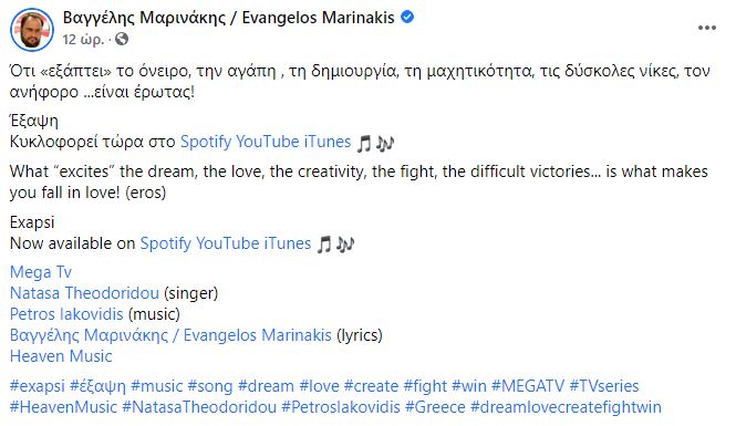 Ο Βαγγέλης Μαρινάκης έκανε μάλιστα και μια ανάρτηση στο προφίλ του στο Facebook, σχετικά με το νέο τραγούδι της Νατάσας Θεοδωρίδου για τη σειρά «Έξαψη», γράφοντας χαρακτηριστικά: