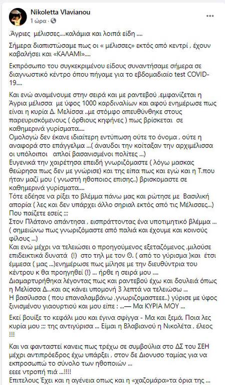 Η πρωταγωνίστρια της σειράς Χαιρέτα μου τον πλάτανο, μέσα από ένα μακροσκελές κείμενο της, διαμαρτυρήθηκε για όσα εξελίχθηκαν σε διαγνωστικό κέντρο. Τα «έβαλε» με πρωταγωνίστρια των Άγριων Μελισσών.