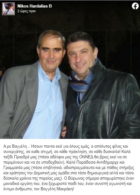 Βαρύ πένθος για τον Νίκο Χαρδαλιά, καθώς εδώ και λίγες ώρες θρηνεί την απώλεια του καλού του φίλου και συνεργάτη, Βαγγέλη Μακράκη.
