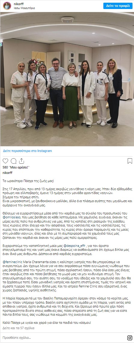 Μεταξύ άλλων, ο Νίκος Ορφανός έγραψε: «Το ωραιότερο Πάσχα της ζωής μας! Στις 17 Απριλίου, πριν από 13 ημέρες ακριβώς γεννήθηκε η κόρη μας. Ήταν δύο εβδομάδες πρόωρη και ελλιποβαρής, έμεινε 13 ημέρες στην μονάδα φροντίδας νεογνών. Σήμερα την πήραμε σπίτι. Είναι μικροσκοπική, με ξανθοκόκκινο μαλλάκι, άλλο ένα πλάσμα αγάπης που μεγάλωσε και ομόρφυνε την οικογένειά μας».