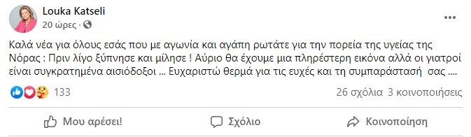 «Καλά νέα για όλους εσάς που με αγωνία και αγάπη ρωτάτε για την πορεία της υγείας της Νόρας: Πριν λίγο ξύπνησε και μίλησε!