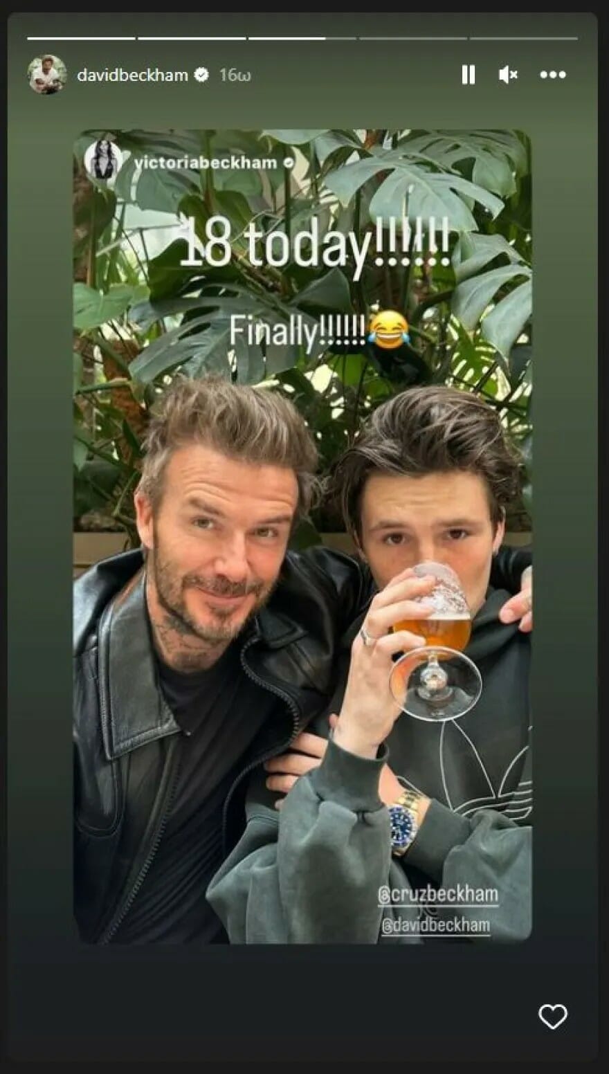 «Ευτυχισμένα 18 χρόνια στο μικρό μας αγόρι! Σε αυτό το απίστευτο αγόρι με αυτή την απίστευτη ενέργεια και την τεράστια καρδιά. Είμαστε τόσο περήφανοι και σε αγαπάμε τόσο πολύ Cruzie» έγραψε ο Ντέιβιντ Μπέκαμ στη λεζάντα της ανάρτησης ενώ με τη σειρά της, η μαμά της οικογένειας και σχεδιάστρια μόδας Βικτόρια, αναδημοσίευσε το βίντεο και έγραψε: «Χρόνια πολλά Cruzie! Σε αγαπάμε όλοι τόσο πολύ και είμαστε τόσο περήφανοι για το υπέροχο αγόρι που έχεις γίνει. Είσαι τα πάντα μας. Ευτυχισμένα 18 superstar!».
