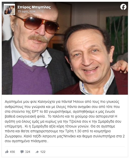 «Αγαπημένε μου φιλε Καληνύχτα για πάντα! Ήσουν από τους πιο γλυκούς ανθρώπους που γνώρισα και με έλεγες πάντα ανηψάκι σου από τότε που στα στούντιο της ΕΡΤ το 80 γνωριστήκαμε, αγαπηθήκαμε κ μας ένωσε βαθειά οικογενειακή φιλία.. Το ταλέντο και το χιούμορ σου αστειρευτα! Η αγάπη για όλους εμάς μα κυρίως για την Τζούλια σου κ την Σμαράγδα σου υπέρμετρη.. Κι η Σμαράγδα αξία κόρη τέτοιων γονιών. Θα σε αγαπαμε πάντα και θα’σε αποχαιρετησουμε την Τρίτη 1.30 από το κοιμητήριο Ζωγραφου..Καλό ταξίδι λατρευτε μας’Ντινάκο και θερμα συλλυπητήρια στα 2 σου αγαπημένα πλάσματα..» γράφει στην ανάρτησή του ο Σπύρος Μπιμπίλας.