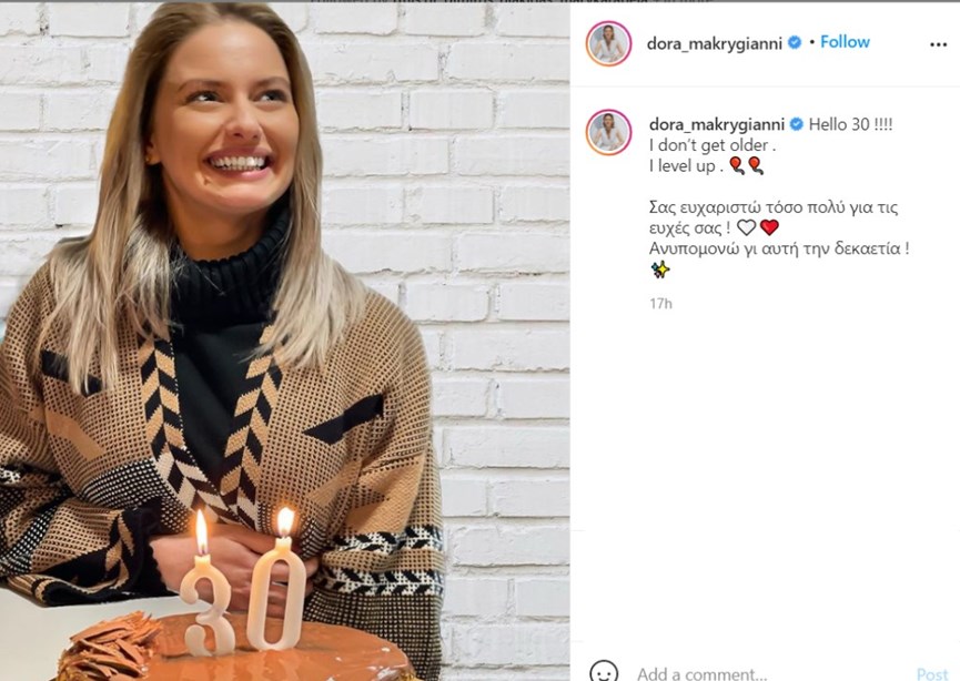 “Ηello 30 !!!! I don’t get older . I level up . Σας ευχαριστώ τόσο πολύ για τις ευχές σας ! Ανυπομονώ γι αυτή την δεκαετία !” έγραψε η Ντόρα Μακρυγιάννη στη λεζάντα της φωτογραφίας που κοινοποίησε.
