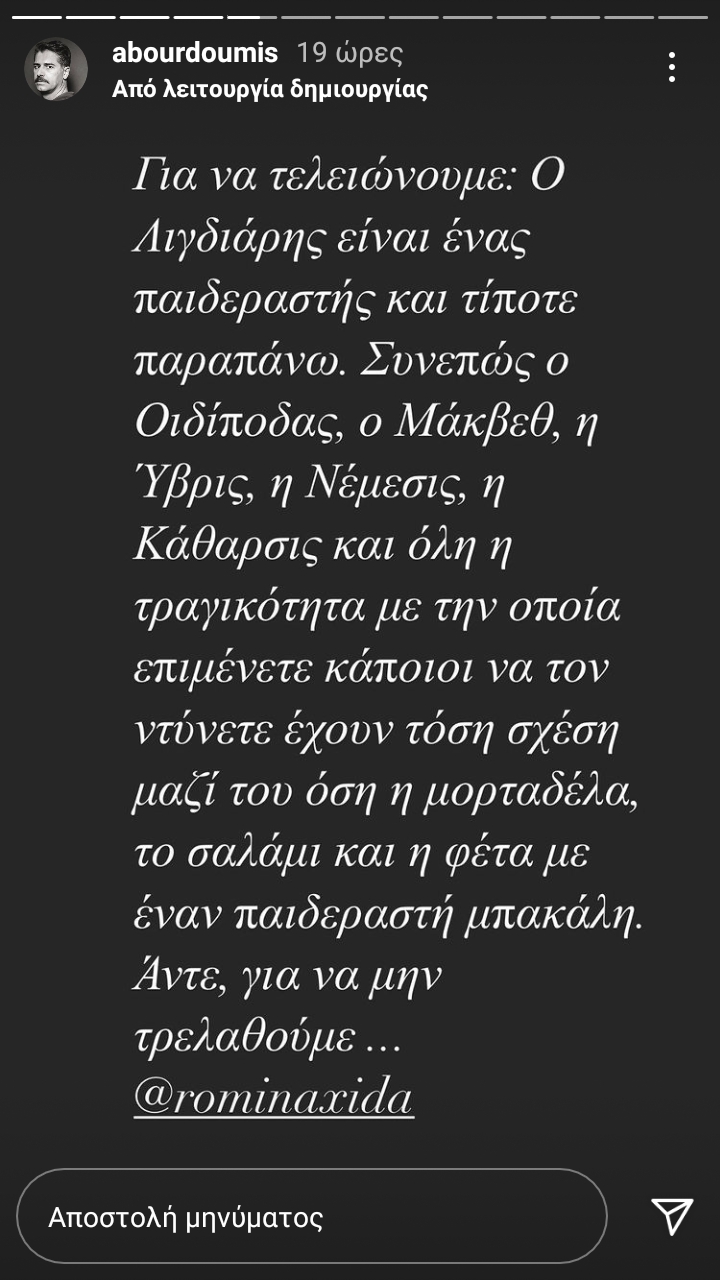 O ηθοποιός δημοσίευσε ένα story στο instagram του όπου μιλάει για ηθοποιό – σκηνοθέτη που βρίσκεται στο επίκεντρο της δημοσιότητας μετά τις καταγγελίες.