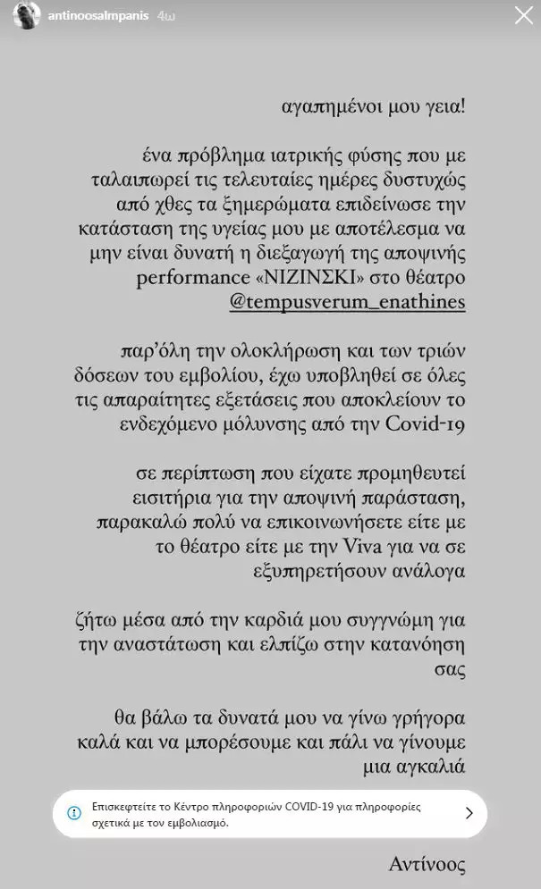 Ζητώ μέσα από την καρδιά μου συγγνώμη για την αναστάτωση και ελπίζω την κατανόησή σας. Θα βάλω τα δυνατά μου για να γίνω γρήγορα καλά και να μπορέσουμε πάλι να γίνουμε μια αγκαλιά». Έγραψε στο story του στο Instagram για να εξηγήσει τι συμβαίνει.