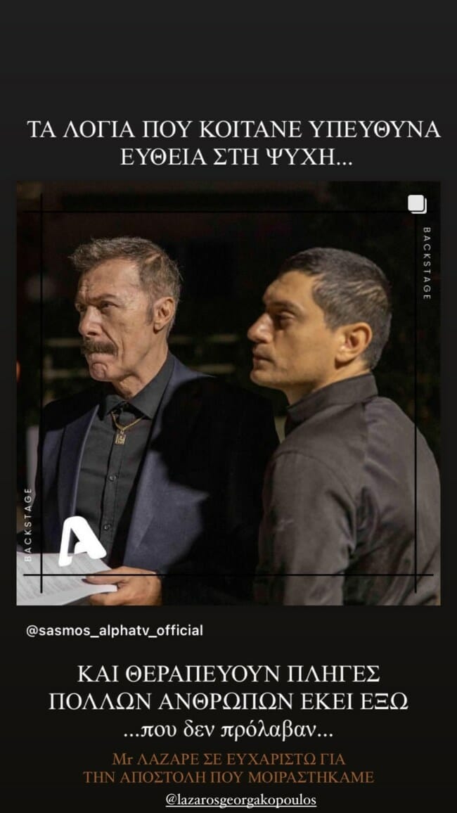 Κοινοποιώντας δύο φωτογραφίες τους από τα γυρίσματα της σειράς, ο Αργύρης Πανταζάρας έγραψε για τον Λάζαρο Γεωργακόπουλο: «Mr Λάζαρε σε ευχαριστώ για την αποστολή που μοιραστήκαμε».