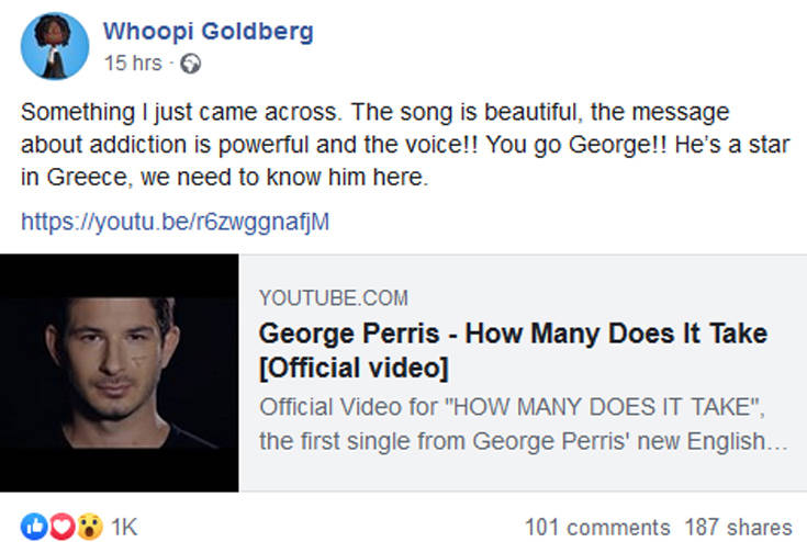 «Κάτι που εντόπισα . Το τραγούδι είναι υπέροχο, το μήνυμα για τον εθισμό είναι δυνατό και η φωνή! Προχώρα Γιώργο! Είναι αστέρι στην Ελλάδα και πρέπει να τον γνωρίσουμε κι εμείς εδώ», ήταν το σχόλιο που συνόδευσε το κλιπ του τραγουδιού. Μάλιστα, πριν λίγα χρόνια, η διάσημη ηθοποιός είχε μιλήσει ανοιχτά για τον εθισμό της στις ναρκωτικές ουσίες.