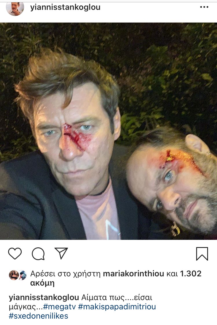 … μαζί με τον Μάκη Παπαδημητρίου υποστηρίζουν τη φράση «περνάμε καλά κι αυτό βγαίνει προς τα έξω». Με ένα στιγμιότυπο από τα γυρίσματα της νέας σειράς του Mega «Σχεδόν ενήλικες», της Μυρτώς Κοντοβά, δείχνουν να διασκεδάζουν παρά το γεγονός ότι έιναι κι οι δύο τους μέσα στα αίματα. Ο Γιάννης Στάνκογλου μάλιστα μοιράστηκε την στιγμή αυτή στον λιγαριασμό του στο Instagram με την λεζάντα «αίματα πως είσαι μάγκας».