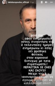 Ο Λάκης Λαζόπουλος σε ανάρτηση του στα social media ενημέρωσε όλους όσους ήρθαν σε επαφή μαζί του γιατί πλέον είναι θετικός στον κορωνοϊό.