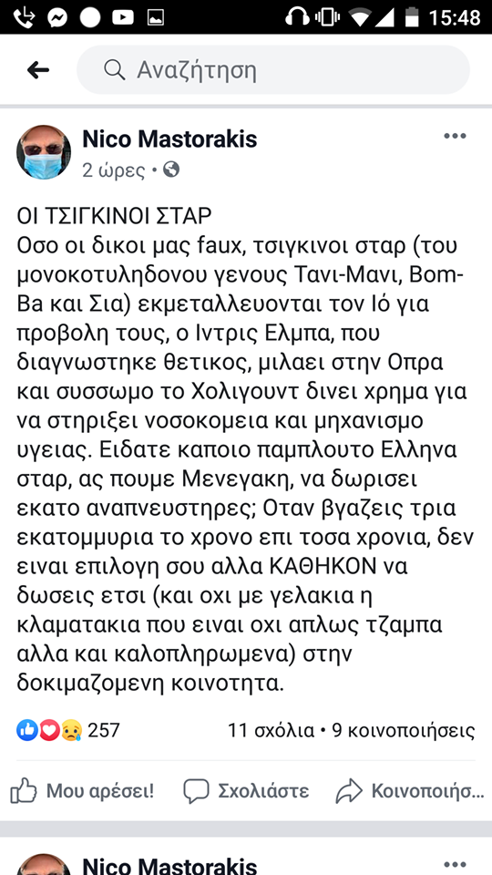 Πάντα ήταν ενεργός στα social media, αλλά ειδικά τώρα, την εποχή του κορωνοϊού, είναι ακόμη περισσότερο. Πριν από λίγο, με ανάρτησή του στο facebook, ο Νίκος Μαστοράκης «ξεσκίζει» την Ελένη Μενεγάκη, το ζεύγος Τανιμανίδη-Μπόμπα αλλά και όλους τους Έλληνες μεγιστάνες που δεν παίρνουν ως παράδειγμα αυτό που συμβαίνει στο Χόλιγουντ και δεν βάζουν το χέρι στην τσέπη να προσφέρουν κάτι στον κόσμο.