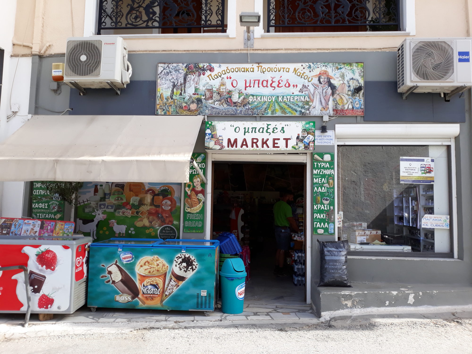 Από προϊόντα ευρείας κατανάλωσης, μέχρι ντόπια παραδοσιακά προϊόντα όπως τα περίφημα τυριά της Νάξου (μυζήθρα, φέτα, γραβιέρα), γλυκά του κουταλιού, κρασί, μέλι και πολλά ακόμη εκλεκτά προϊόντα. Στο παντοπωλείο θα βρείτε όλα τα φρέσκα φρούτα και λαχανικά.