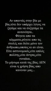 «Αν απαντάς στη βία με βία, τότε δεν υπάρχει λόγος να ζητάμε και να συζητάμε τα αυτονόητα. Φύγετε από τα κόμματα, φύγετε από τις στολές και δείτε μόνο τον άνθρωπο, όποιος κι αν είναι. Είτε αστυνομικός, είτε απλός πολίτης, είτε  άντρας, είτε γυναίκα.