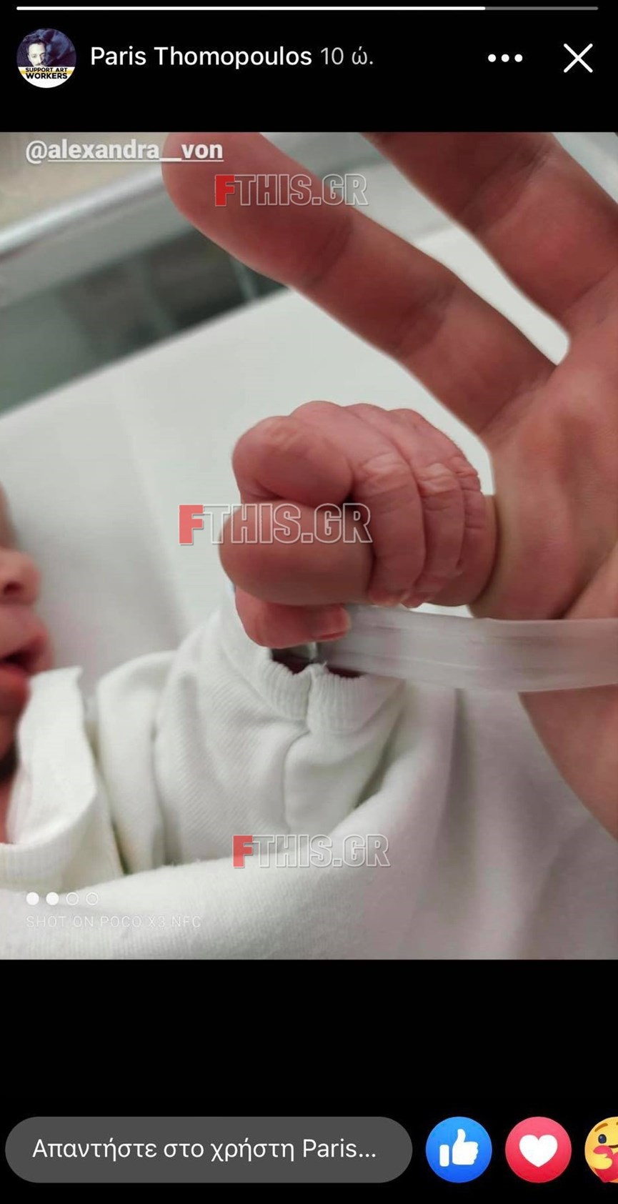 Η αγαπημένη του Αλεξάνδρα έφερε στον κόσμο πριν από λίγες ημέρες τον καρπό του έρωτά τους και την ευχάριστη είδηση ανακοίνωσε ο ίδιος ο Πάρις Θωμόπουλος στον προσωπικό του λογαριασμό στο Facebook. Συγκεκριμένα, ο Πάρις πόσταρε μια φωτογραφία από το μαιευτήριο, στην οποία βλέπουμε το χεράκι του παιδιού να κρατάει το δικό του.