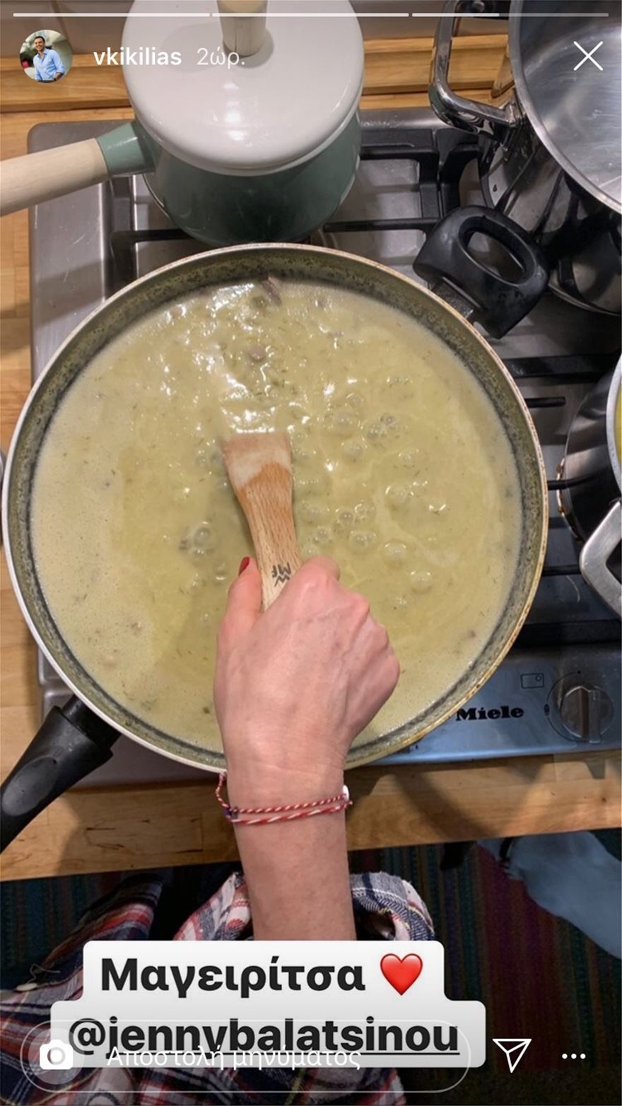 Ενθουσιασμένος δείχνει με τις μαγειρικές ικανότητες της συζύγου του, ο υπουργός Υγείας Βασίλης Κικίλιας. Η Τζένη Μπαλατσινού, μπήκε σήμερα στην κουζίνα για να φτιάξει την παραδοσιακή μαγειρίτσα και το αποτέλεσμα σύμφωνα με τις αντιδράσεις του υπουργού ξεπέρασε κάθε προσδοκία… Ο Βασίλης Κικίλιας ανάρτησε στο instagram μια φωτογραφία της μαγειρίτσας την οποία συνόδευσε μάλιστα με μια μεγάλη κόκκινη καρδιά!