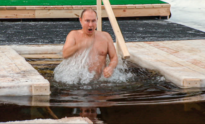 Ο Πούτιν, αφού αποχωρίστηκε το ζεστό του παλτό, βούτηξε στα παγωμένα νερά, την ώρα που η θερμοκρασία είχε πέσει στους -20 βαθμούς Κελσίου. Όπως προστάσει το τελετουργικό, ο Πούτιν βούτηξε τρεις φορές στο όνομα του Πατρός, του Υιού και του Αγίου Πνεύματος. Το νερό είχε ευλογηθεί από έναν κληρικό και εκτιμάται ότι έχει δυνάμεις προστασίας και θεραπείας.