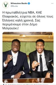 Μία ιδιαίτερη ευχή έκανε μέσω του επίσημου λογαριασμού της στο Twitter η ομάδα των αδελφών Αντετοκούμπο Milwaukee Bucks.