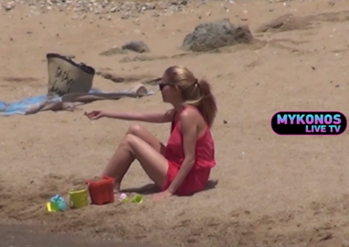 Η κάμερα του Mykonos Live Tv απαθανάτισε το ζευγάρι στην παραλία της Φτελιάς μαζί με τον μικρό Σάββα και ένα από τα σκυλιά της οικογένειας. Η πρωην Σταρ Ελλας και παρουσιάστρια επέλεξε να φορέσει ένα αέρινο κόκκινο φορεματάκι παραλίας κλέβοντας τις εντυπώσεις με το καλλίγραμμο σώμα της, ενώ δεν σταμάτησε τα παιχνίδια με τον μικρό Σάββα. Μαμά και γιος έφτιαξαν κατασκευές στην άμμο και απόλαυσαν τον ήλιο και τη θάλασσα .