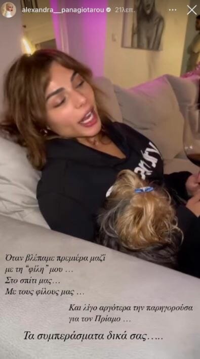 Συγκεκριμένα, το Instagram story που ανέβασε έγραφε: «Όταν βλέπαμε πρεμιέρα μαζί με την “φίλη μου”, στο σπίτι μας, με τους φίλους μας και λίγο αργότερα την παρηγορούσα για τον Πρίαμο. Τα συμπεράσματα δικά σας».