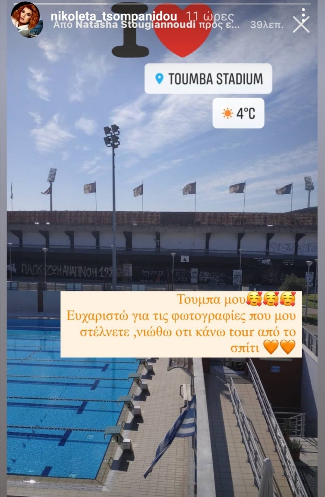 «Τούμπα μου. Ευχαριστώ για τις φωτογραφίες, που μου στέλνετε, νιώθω ότι κάνω tour από το σπίτι», έγραψε χαρακτηριστικά κοινοποιώντας μία φωτογραφία από το σημείο.