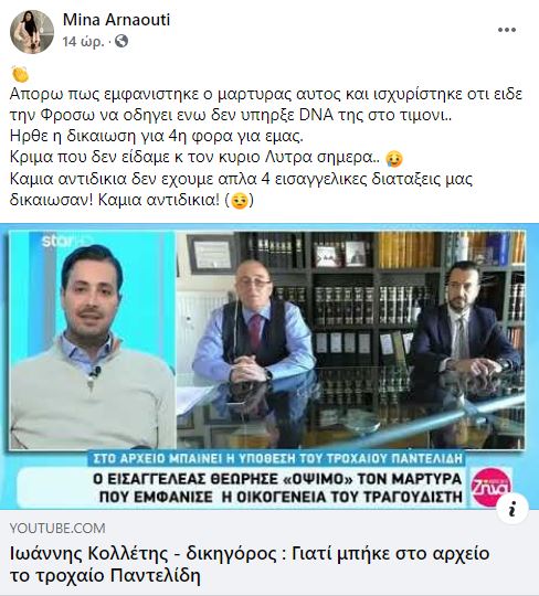«Απορώ πως εμφανίστηκε ο μάρτυρας αυτός και ισχυρίστηκε ότι είδε την Φρόσω να οδηγεί ενώ δεν υπήρξε DNA της στο τιμόνι.. Ήρθε η δικαίωση για 4η φορά για εμάς. Κρίμα που δεν είδαμε και τον κύριο Λύτρα σήμερα.. Καμία αντιδικία δεν έχουμε απλά 4 εισαγγελικές διατάξεις μας δικαίωσαν! Καμία αντιδικία!» έγραψε στην ανάρτησή της η Μίνα Αρναούτη.