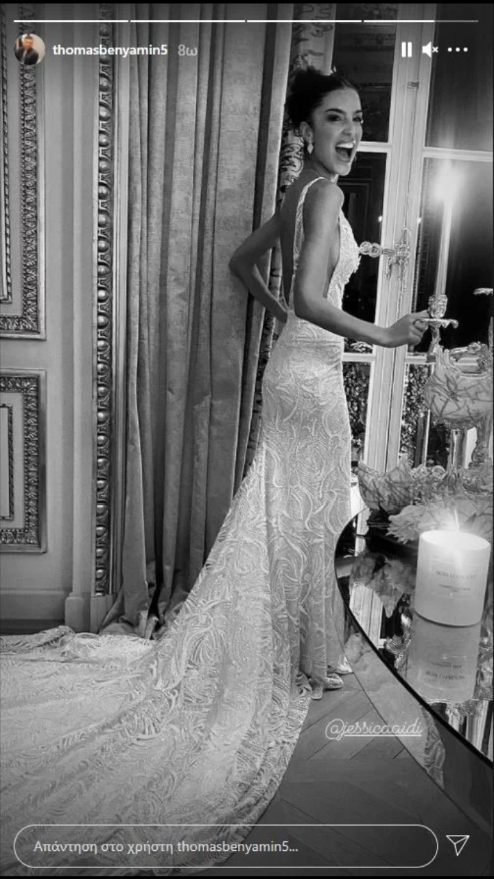 Όπως θα δείτε, η νύφη ήταν ιδιαίτερα κομψή, φορώντας νυφικό-κοστούμι από λευκή δαντέλα, χρυσό κολιέ και λευκά σανδάλια.