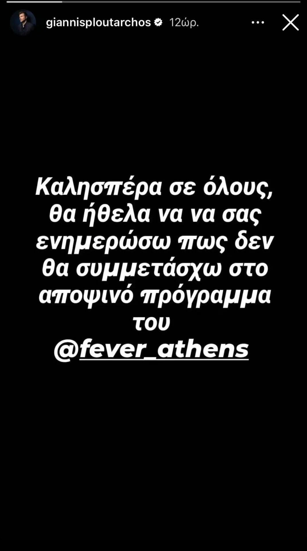 «Καλησπέρα σε όλους. Θα ήθελα να σας ενημερώσω ότι δεν θα συμμετέχω απόψε στο πρόγραμμα του Fever», έγραψε χαρακτηριστικά ο Γιάννης Πλούταρχος.