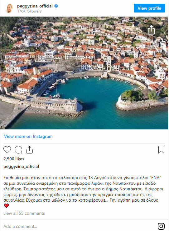 Η καλλιτέχνιδα έγραψε χαρακτηριστικά: «Επιθυμία μου ήταν αυτό το καλοκαίρι στις 13 Αυγούστου να γίνουμε όλοι ‘ΕΝΑ’ σε μια συναυλία ονειρεμένη στο πανέμορφο λιμάνι της Ναυπάκτου με είσοδο ελεύθερη.