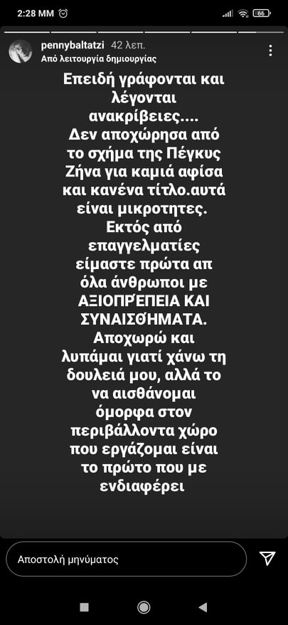Το οποίο αναφερόταν στους λόγους που η τραγουδίστρια αποχώρησε από το νυχτερινό σχήμα με την Πέγκυ Ζήνα.