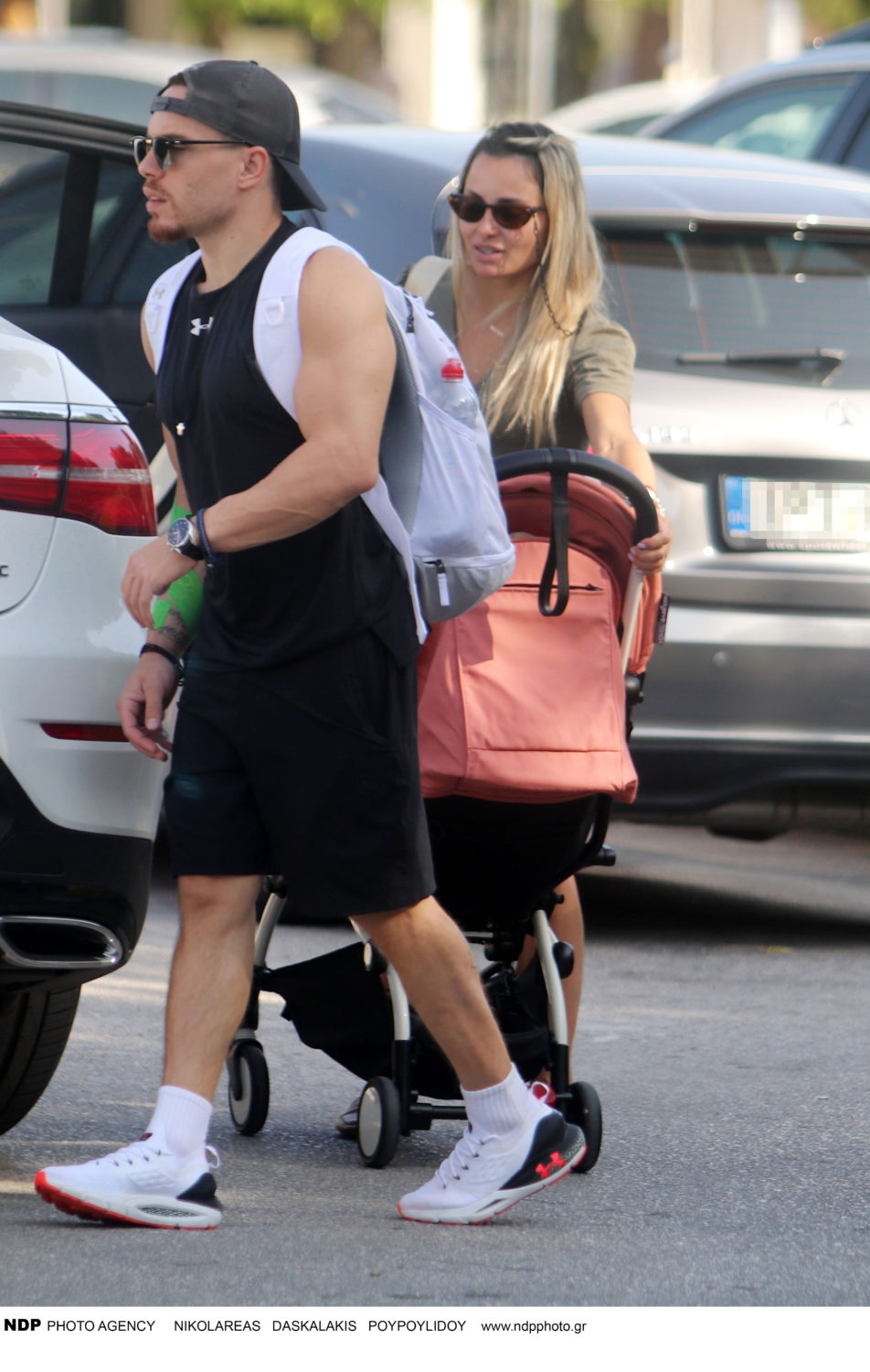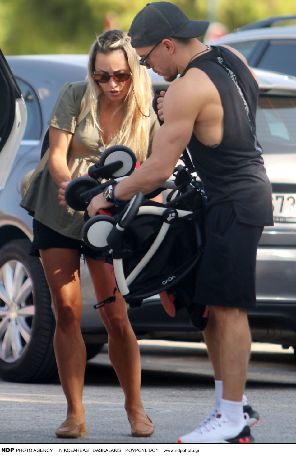 Η αθλήτρια ρυθμικής γυμναστικής φορούσε ένα μαύρο σορτ συνδυάζοντάς το με μια χακί μπλούζα, μπεζ τσάντα και καφέ παπούτσια. Από την άλλη ο ολυμπιονίκης ήταν ντυμένος με αθλητικό στυλ καθώς κρατούσε το καρότσι με την έντεκα μηνών κόρη τους.
