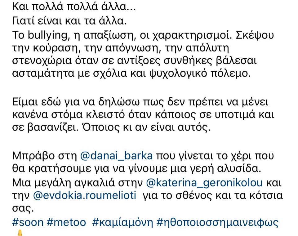 Με μια ανάρτηση στον προσωπικό της λογαριασμό στο Instagram, η Πηνελόπη Αναστασοπούλου εξέφρασε την αγάπη και τη στήριξή της στη Ζέτα Δούκα, την Κατερίνα Γερονικολού και την Ευδοκία Ρουμελιώτη, ενώ αποκάλυψε και η ίδια πως έχει υποστεί ψυχολογική και λεκτική βία.