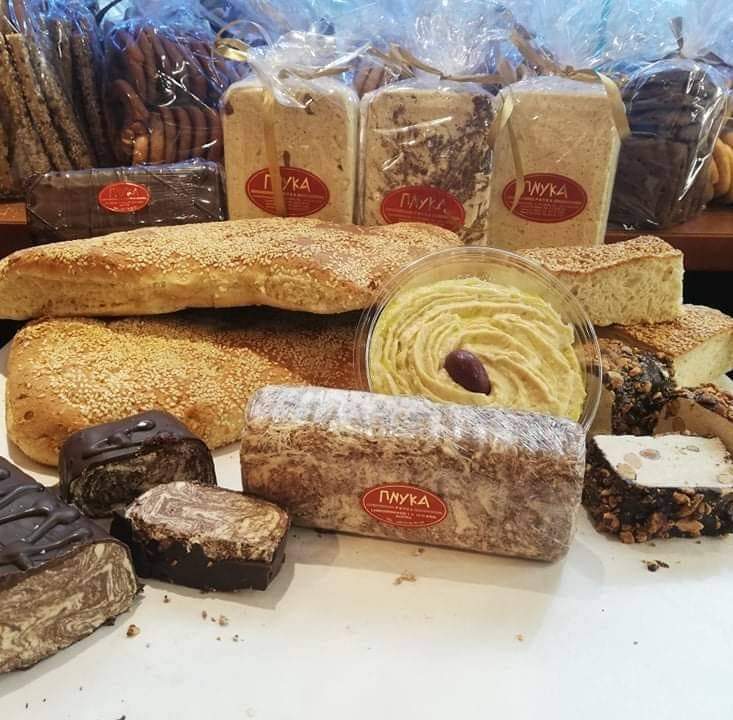 Στο PNYKA BAKERY, κάθε μέρα θα βρείτε φρέσκο ψωμί και μια μεγάλη ποικιλία από αρτοσκευάσματα και γλυκά. Οι παραγωγές τους γίνονται στο δικό τους εργαστήριο, διασφαλίζοντας έτσι την εξαιρετική ποιότητα. Το αλεύρι παράγεται στον πετρόμυλό τους, καθώς και οι πρώτες ύλες είναι διαλεγμένες από τοπικούς παραγωγούς. Εκτός από τα κλασικά προϊόντα, αξίζει να δοκιμάσετε την εξαιρετική χειροποίητη ταραμοσαλάτα και μελιτζανοσαλάτα, φτιαγμένα με πρώτης ποιότητας υλικά αλλά και τους χειροποίητους χαλβάδες τους.