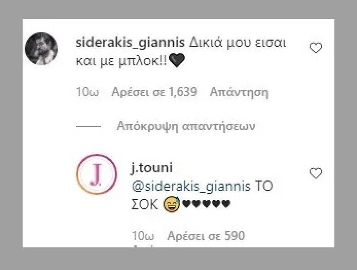 Τελικά, όπως φαίνεται ο έρωτας καλά κρατεί, με τον Σιδεράκη να σχολιάζει με… άκρως ιδιαίτερο τρόπο τη νέα της φωτογραφία στο Instagram, αποκαλύπτοντας πως η Τούνη τον είχε κάνει block.