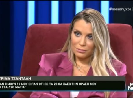 Η Κατρίνα Τσάνταλη, μίλησε στην Ελεονώρα Μελέτη για την ασθένεια με την οποία διαγνώστηκε όταν ήταν 19 ετών, η οποία οδηγεί σε τύφλωση. Όπως αποκάλυψε είχε τρομοκρατηθεί, μόλις ενημερώθηκε για το πρόβλημα υγείας της, ενώ αναφέρθηκε και στον τρόπο με τον οποίο την αντιμετώπισε. «Μελαχρωστική αμφιβληστροειδοπάθεια λέγεται το θέμα που έχω με το μάτι μου. Όταν μου το είπαν ούτε εγώ το θυμόμουν. Όταν το ανακάλυψα σπούδαζα στην Αγγλία. Συνειδητοποίησα πως κάτι πάει λάθος με τα μάτια μου και νόμιζα πως έχω μυωπία. Έκλεισα ραντεβού και με κράτησαν 7 ώρες. Στο τέλος ο Άγγλος γιατρός μου είπε πως έχω αυτή την ασθένεια και δεν υπάρχει κάτι που μπορώ να κάνω. Και ότι μέχρι τα 25-28 θα χάσω πλήρως την όραση μου και στα δύο μάτια. Δεν ήθελα να πω κάτι στους γονείς μου μέχρι να είμαι σίγουρη”. Είπε και συνέχισε “Πήρα κλαίγοντας τον μπαμπά μου και του είπα ότι θα χάσω την όρασή μου. Τελικά είμαι πάρα πολύ τυχερή γιατί είναι μόνο στο ένα μου μάτι, και κάνουν ισορροπία τα δύο μου μάτια και βλέπω κανονικά. Δεν υπάρχει περίπτωση να κυκλοφορώ με το καλό μου μάτι κλειστό, να στο πω κι έτσι. Και όταν το ψάξαμε καλύτερα, πήγα σε ειδικό γιατρό που κάνει την έρευνα πάνω στη μελαχρωστική, τον ρώτησα “Έχετε παιδιά;’’ Μου λέει “Ναι έχω τρεις κόρες”. “Τέλεια”, του λέω. “Επειδή δεν είμαι 80 ετών αλλά 19 θέλω να μου το πείτε όπως θα το λέγατε στην κόρη σας”, όχι σαν να ήμουν μια μεγάλη γυναίκα που δεν έγινε και τίποτα αν τυφλωθεί όπως με αντιμετώπισαν άλλοι».