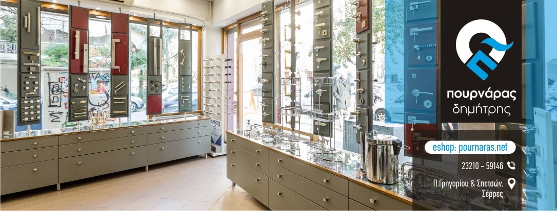 Μεγάλη ποικιλία προϊόντων σας περιμένει και στο φυσικό κατάστημα στις Σέρρες, μεταξύ άλλων λαβές εξώπορτας, πόμολα πόρτας, κουρτινόξυλα, νεροχύτες και μπαταρίες κουζίνας, αξεσουάρ τζακιού και πολλά ακόμη.