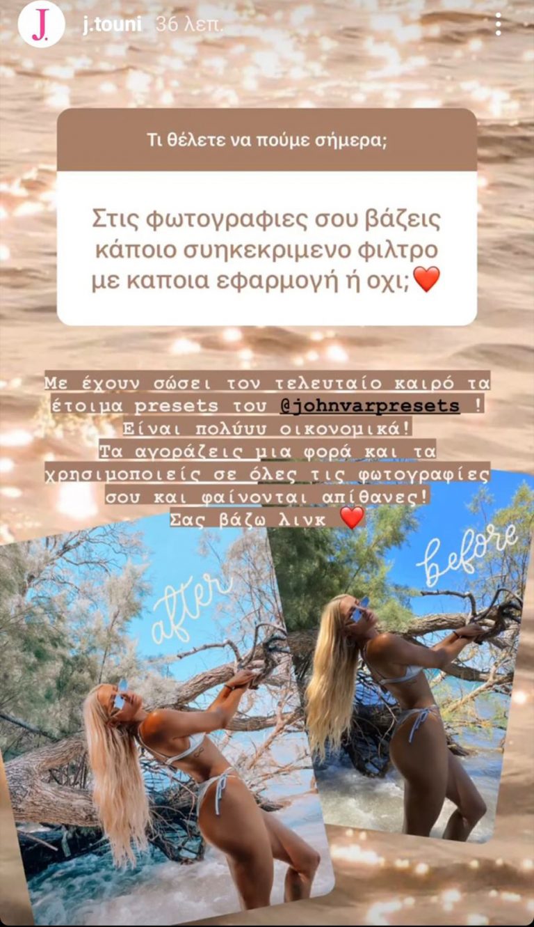 Σε ερώτηση ακόλουθού της για το ποια εφαρμογή χρησιμοποιεί, η Θεσσαλονικιά απάντησε ότι χρησιμοποιεί έτοιμα presets τα οποία αγοράζει διαδικτυακά. Μάλιστα έδωσε και το link της εφαρμογής ενώ παράλληλα τόλμησε να δείξει δίπλα δίπλα δύο φωτογραφίες της, μία πριν και μία μετά από τη ψηφιακή επεξεργασία, με τη διαφορά να είναι πράγματι εντυπωσιακή.