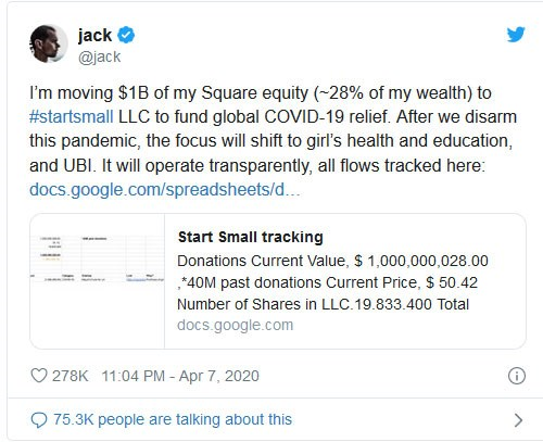 Ο διευθύνων σύμβουλος του Twitter, Jack Dorsey, ανακοίνωσε μέσα από τα social media ότι θα διαθέσει ένα δισεκατομμύριο δολάρια από την προσωπική περιουσία του για να χρηματοδοτήσει την έρευνα κατά του κορωνοϊού. Ο 43χρονος Dorsey, ο οποίος υπήρξε συνιδρυτής του Twitter το 2006 και στη συνέχεια είχε δημιουργήσει επίσης την εταιρεία πληρωμών Square, έκανε γνωστό μέσω tweet ότι δωρίζει μετοχές της Square, αξίας ενός δισεκατομμυρίου δολαρίων, σε ένα δικό του μη κερδοσκοπικό ταμείο, το Start Small, που θα χρηματοδοτήσει διεθνώς προσπάθειες για την καταπολέμηση της νόσου Covid-19. Μάλιστα η περιουσία του Dorsey υπολογίζεται από το Forbes σε περίπου 3,3 δισεκατομμύρια δολάρια και όπως ο ίδιος ανέφερε η δωρεά του αποτελεί περίπου το 28% της συνολικής αξίας του πλούτου του. Είναι μέχρι σήμερα η μεγαλύτερη -με διαφορά- δωρεά που έχει γίνει παγκοσμίως για την αντιμετώπιση της πανδημίας.