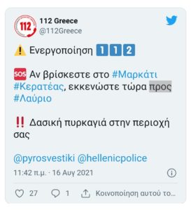 Η Γενική Γραμματεία Πολιτικής Προστασίας έχει αποστείλει μήνυμα μέσω του 112 για να ανακοινωθεί άμεσα η περιοχή Μαρκάτι.