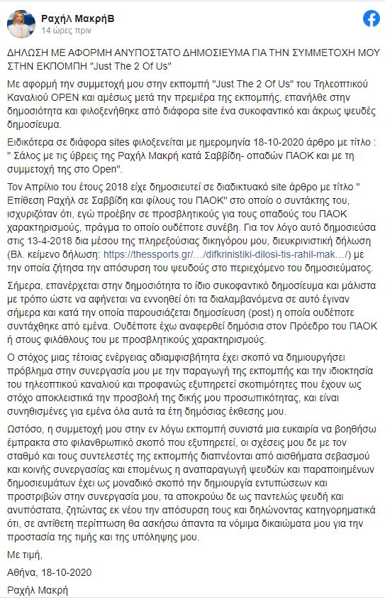 Ανακοίνωση-απάντηση σε διάφορα δημοσιεύματα που κάνουν τον γύρο του διαδικτύου, σχετικά με τη συμμετοχή της στο «Just The 2 of Us» και παλιότερες αναρτήσεις της για τον Ιβάν Σαββίδη και τους φιλάθλους του ΠΑΟΚ, εξέδωσε η Ραχήλ Μακρή.